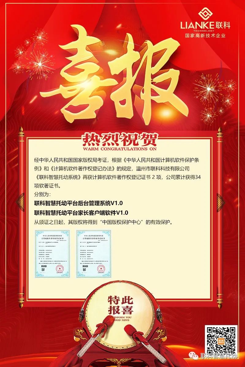 【喜報】熱烈祝賀我司《聯(lián)科智慧托幼系統(tǒng)》榮獲多項計算機軟件著作權(quán)