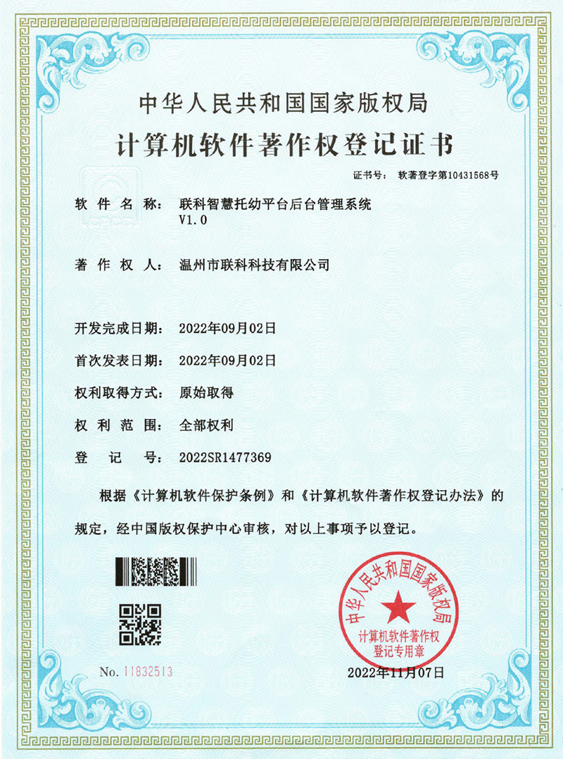 《聯(lián)科智慧托幼平臺后臺管理系統(tǒng)V1.0》于2022年11月07日被正式授予《中華人民共和國國家版權(quán)局計算機軟件著作權(quán)登記證書》,登記號為2020SR1477369。