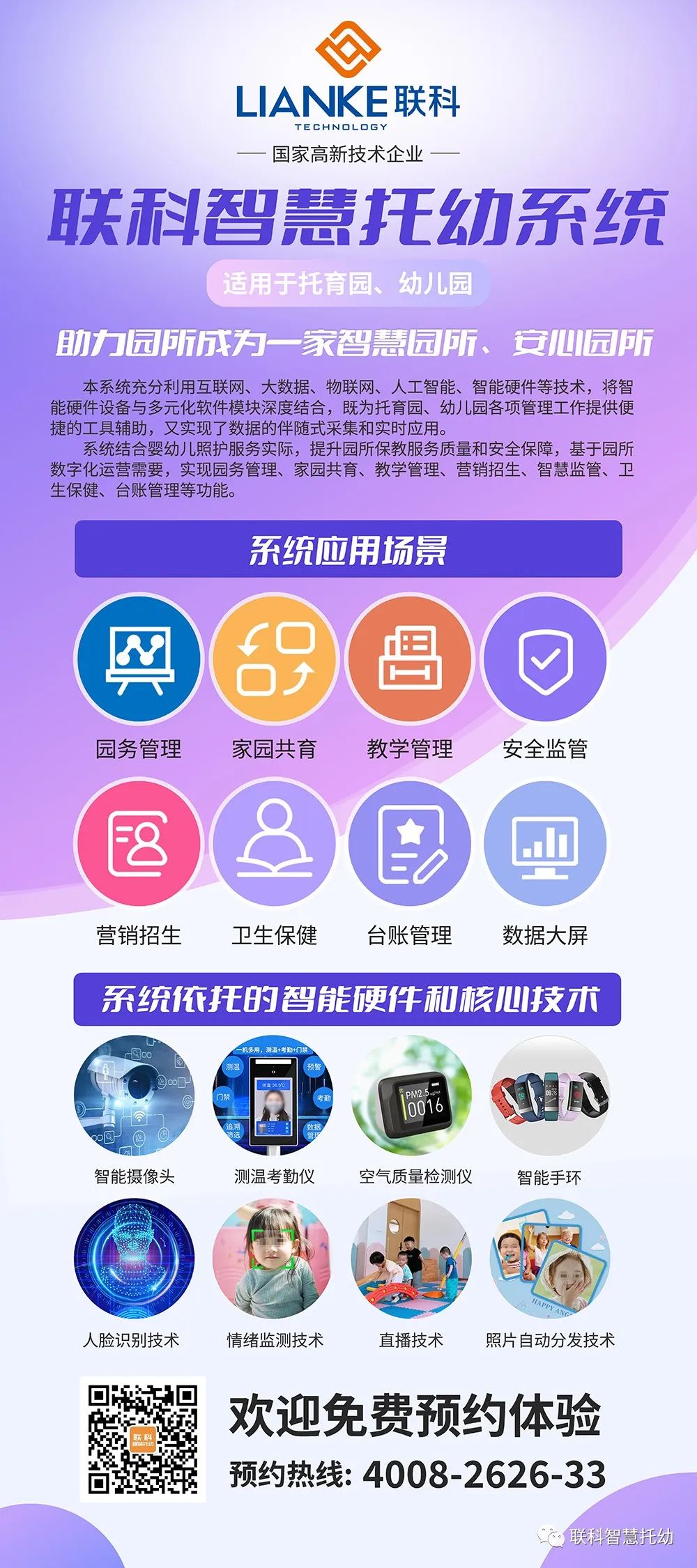 《聯(lián)科智慧托幼系統(tǒng)》充分利用互聯(lián)網(wǎng)、大數(shù)據(jù)、物聯(lián)網(wǎng)、人工智能、智能硬件等技術(shù),將智能硬件設(shè)備與多元化軟件模塊深度結(jié)合,既為托育園、幼兒園各項管理工作提供便捷的工具輔助,又實現(xiàn)了數(shù)據(jù)的伴隨式采集和實時應(yīng)用。系統(tǒng)結(jié)合嬰幼兒照護服務(wù)實際,提升園所保教服務(wù)質(zhì)量和安全保障,基于園所數(shù)字化運營需要,實現(xiàn)園務(wù)管理、家園共育、教學(xué)管理、營銷招生、智慧監(jiān)管、衛(wèi)生保健、臺賬管理等功能。