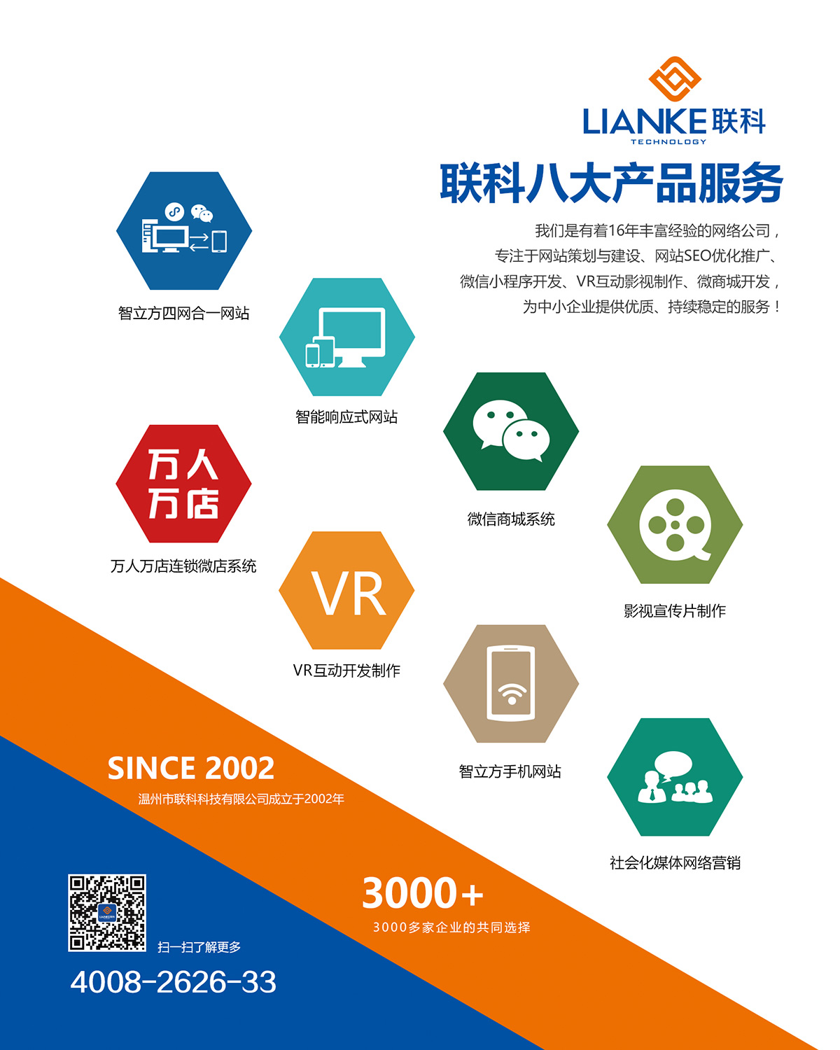 溫州市聯(lián)科科技有限公司成立于2002年,從業(yè)16年以來專注于互聯(lián)網(wǎng)技術(shù)服務(wù),致力于為中國的成長型企業(yè)提供電子商務(wù)整體解決方案,為3000多家中小微企業(yè)提供互聯(lián)網(wǎng)基礎(chǔ)服務(wù)、網(wǎng)站建設(shè)、微信小程序開發(fā)、網(wǎng)絡(luò)營銷推廣、電子商務(wù)平臺(tái)系統(tǒng)開發(fā)等服務(wù)。時(shí)代在不斷變化,新技術(shù)窮出不盡,互聯(lián)網(wǎng)對(duì)企業(yè)的用途,從原來的網(wǎng)站建設(shè)、網(wǎng)絡(luò)營銷推廣到電子商務(wù)平臺(tái)交易,從PC互聯(lián)網(wǎng)到移動(dòng)互聯(lián)網(wǎng),都在不斷迭代升級(jí)。做為一家互聯(lián)網(wǎng)第三方技術(shù)服務(wù)公司,聯(lián)科一直把技術(shù)創(chuàng)新做為公司發(fā)展的重要任務(wù)去抓,不斷推出適應(yīng)企業(yè)發(fā)展的新技術(shù)、新產(chǎn)品、新服務(wù),包括四網(wǎng)合一網(wǎng)站系統(tǒng)、響應(yīng)式網(wǎng)站系統(tǒng)、智立方SEO推廣系統(tǒng)、微信分銷商城系統(tǒng)、萬人萬店連鎖微店系統(tǒng)等。