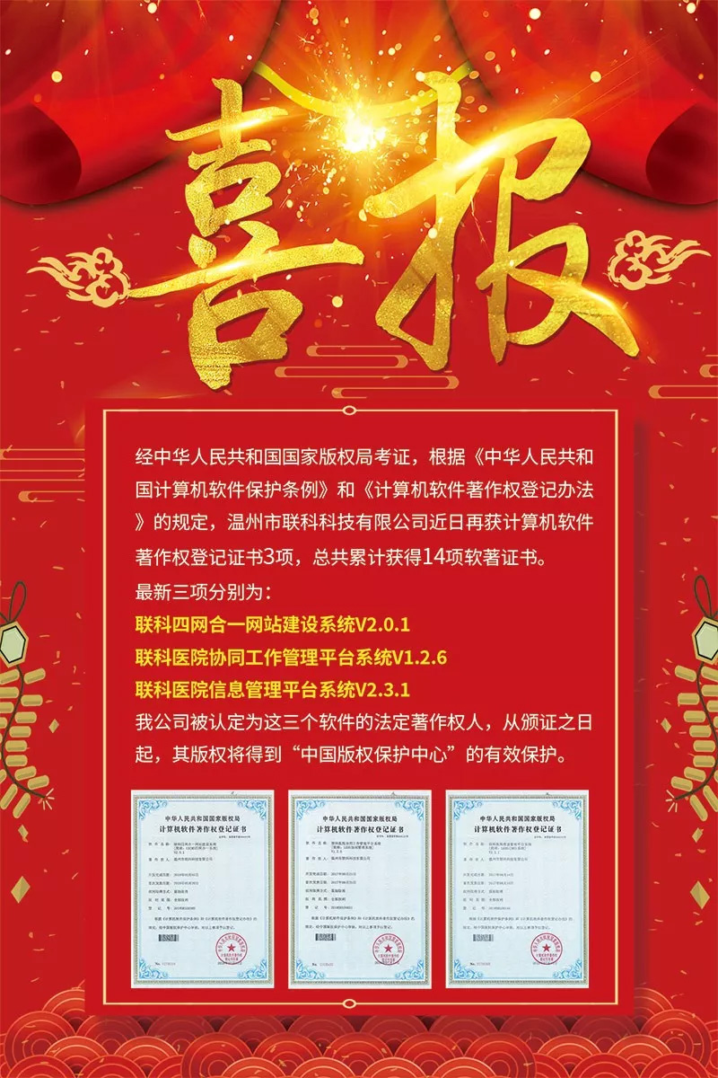 經(jīng)中華人民共和國國家版權(quán)局考證,根據(jù)《中華人民共和國計(jì)算機(jī)軟件保護(hù)條例》和《計(jì)算機(jī)軟件著作權(quán)登記辦法》的規(guī)定,溫州市聯(lián)科科技有限公司近日取得計(jì)算機(jī)軟件著作權(quán)登記證書3項(xiàng)。