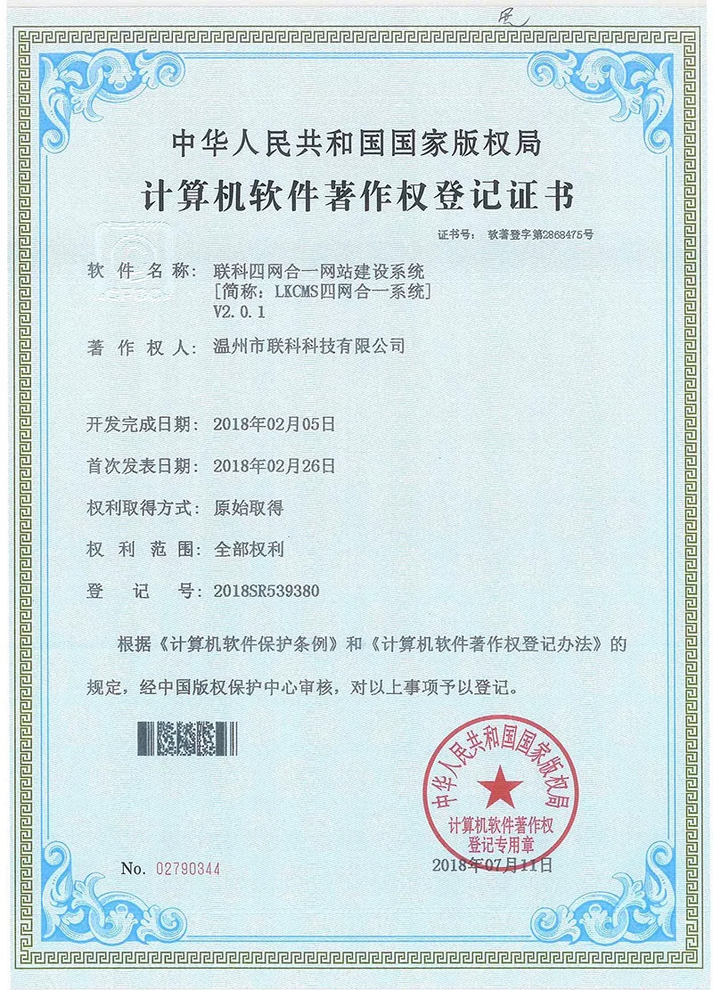 《聯(lián)科四網(wǎng)合一網(wǎng)站建設(shè)系統(tǒng)V2.0.1》于2018年07月11日被正式授予《中華人民共和國國家版權(quán)局計(jì)算機(jī)軟件著作權(quán)登記證書》,登記號為2018SR539380。