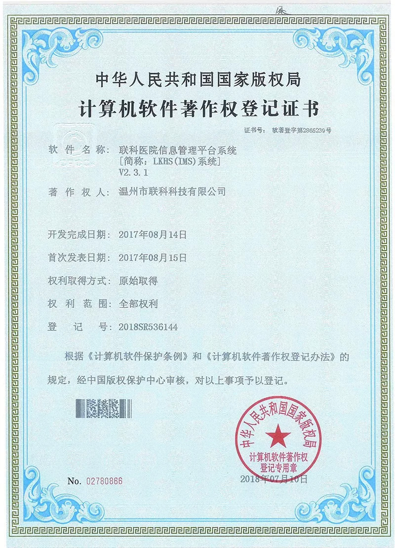 《聯(lián)科醫(yī)院信息管理平臺系統(tǒng)V2.3.1》于2018年07月10日被正式授予《中華人民共和國國家版權(quán)局計(jì)算機(jī)軟件著作權(quán)登記證書》,登記號為2018SR536144。