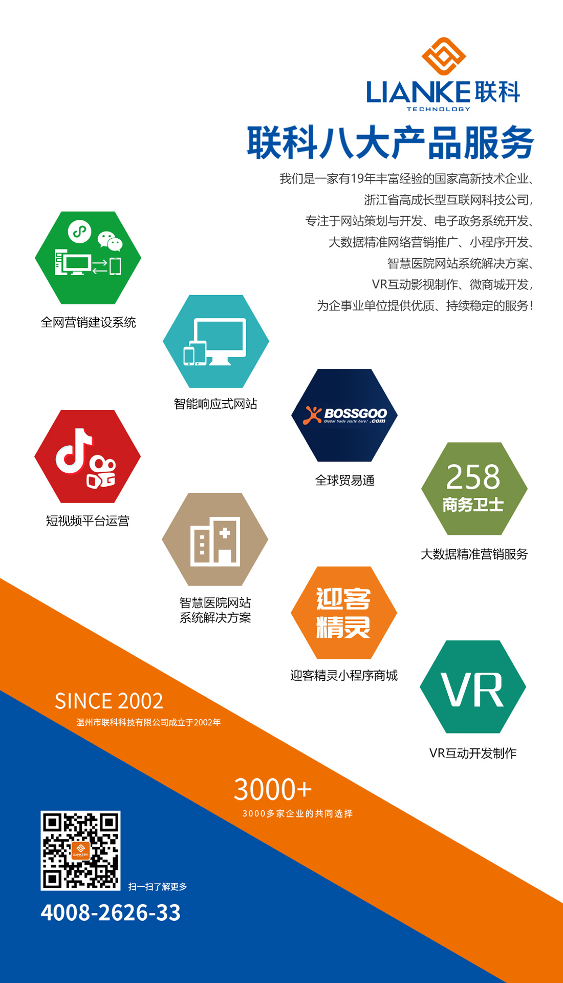 溫州市聯(lián)科科技有限公司成立于2002年,3000多家企業(yè)的共同選擇,致力于為中國的成長型企業(yè)提供電子商務(wù)整體解決方案。從網(wǎng)站建設(shè)開發(fā)、微信小程序開發(fā)、網(wǎng)絡(luò)購物商城系統(tǒng)開發(fā)、智慧醫(yī)院網(wǎng)站系統(tǒng)解決方案、移動(dòng)電商連鎖開店平臺開發(fā)到網(wǎng)絡(luò)營銷整合服務(wù),始終圍繞企業(yè)發(fā)展過程中對銷售力提升的需求,進(jìn)行持續(xù)的服務(wù)創(chuàng)新和產(chǎn)品研發(fā)。