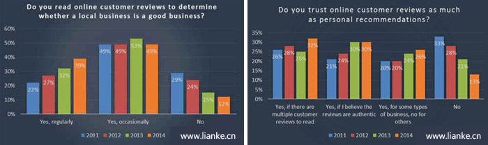 圖1:88%的人閱讀評論來確定本地業(yè)務的質量(左)&88%的消費者表示相信在線評論的個人推薦(右)