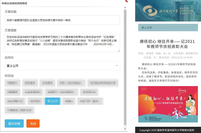 在醫(yī)院內(nèi)容管理系統(tǒng)基礎(chǔ)上開(kāi)發(fā)一套接入企業(yè)微信的系統(tǒng)。能夠?qū)?nèi)容管理系統(tǒng)中的文章推送到企業(yè)微信指定的應(yīng)用號(hào)中??蛇x不同應(yīng)用,不同用戶標(biāo)簽做到信息資源的定向推送。擁有審核機(jī)制,普通用戶申請(qǐng)推送,管理員審核通過(guò)后發(fā)起企業(yè)微信消息推送。極大改善了普通信息資源發(fā)布后用戶被動(dòng)閱讀的弊端。